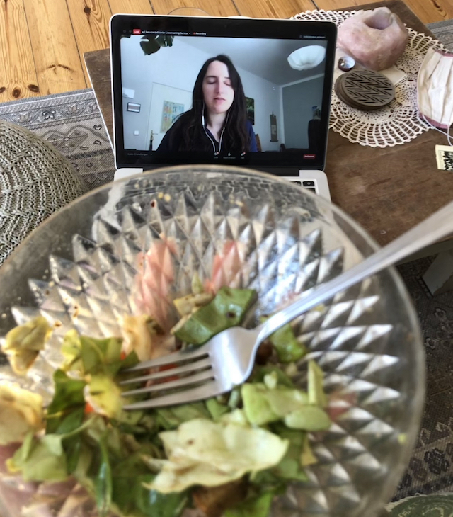 - Salat mit Brotcroutons, Nüsse, Kerne und Champignons garnieren und mit der Schwesti mampfen
